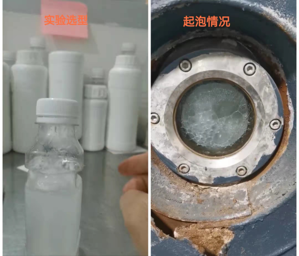 我公司在收集相關(guān)信息并取得水樣后立即安排實驗選型,通過與客戶溝通安排由實驗選出的三款消泡劑上機小試,最終確定出最優(yōu)產(chǎn)品。最終,公司MOVER-1312TP型號蒸發(fā)專用消泡劑的上機效果出眾,高出客戶預(yù)期,成功解決多效蒸發(fā)起泡問題。