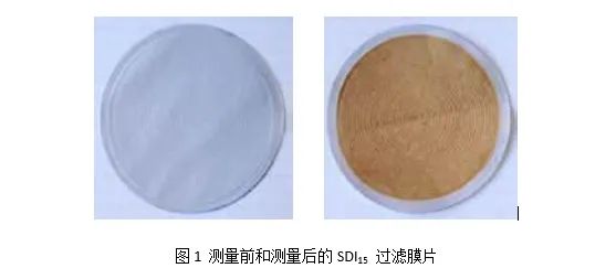 SDI 的測定是在直徑為47mm 孔徑為0.45μm 的微孔濾膜上連續(xù)加入一定壓力(30PSI,相當(dāng)于2.1kg/cm)的被測定水樣,記錄濾得500ml 水所需的時(shí)間Ti(秒)和連續(xù)過濾15 分鐘(T)后再次濾得500ml 水所需的時(shí)間Tf(秒),通過公式計(jì)算SDI 值;一般要求反滲透入口(即超濾產(chǎn)水)的SDI數(shù)值不得超過5。