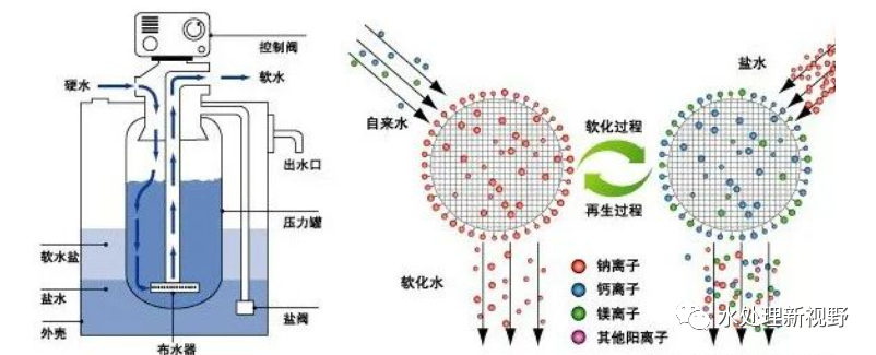 由于水的硬度主要由鈣、鎂形成及表示,故一般采用陽離子交換樹脂(軟水器),將水中的Ca2+、Mg2+(形成水垢的主要成份)置換出來,隨著樹脂內(nèi)Ca2+、Mg2+的增加,樹脂去除Ca2+、Mg2+的效能逐漸降低。